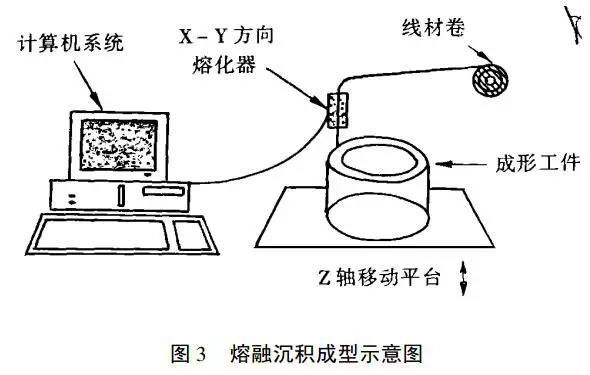 3、熔融沉积成型(FDC) FDC生产效率较高,但表面精度较低。在FDC中通常将陶瓷粉与特制的粘结剂混合,挤制成细丝。通过计算机控制将细丝送入熔化器,在稍高于其熔点的温度下熔化,再从喷嘴挤至成型平面上。通过控制喷嘴在x-y方向和工作平台在z方向的移动可以实现三维部件的成型。该工艺对丝的要求较为严格,需要合适的粘度、柔韧性、弹性模量、强度和结合性能等。