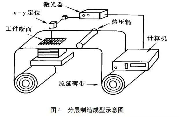 4、分层制造成型(LOM) LOM工艺利用激光在x-y方向的移动切割每一层薄片材料。每完成一层的切割,控制工作平台在z方向的移动以叠加新一层的薄片材料。激光的移动由计算机控制。层与层之间的结合可以通过粘结剂或热压焊合。由于该方法只需要切割出轮廊线,因此成型速度较快,且非常适合制造层状复合材料。用于叠加的陶瓷材料一般为流延薄材。