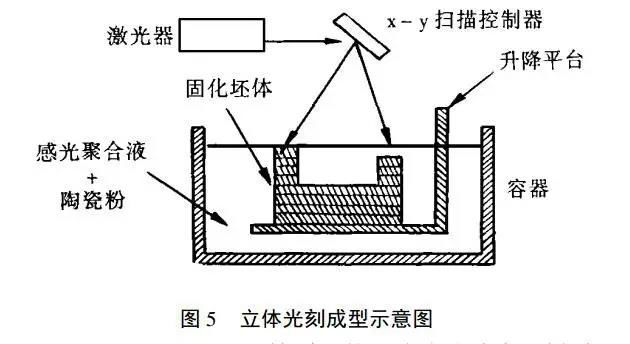 5、立体光刻成型(SL) 首先将陶瓷粉与可光固化的树脂混合制成陶瓷料浆。铺展在工作平台上,通过计算机控制紫外线选择性照射溶液表面。含有陶瓷的溶液通过光聚合形成高分子聚合体结合的陶瓷坯体。通过控制平台在z方向的移动,可以使新的一层溶液流向已固化部分表面。如此反复循环,终就可以形成所需的陶瓷坯体。