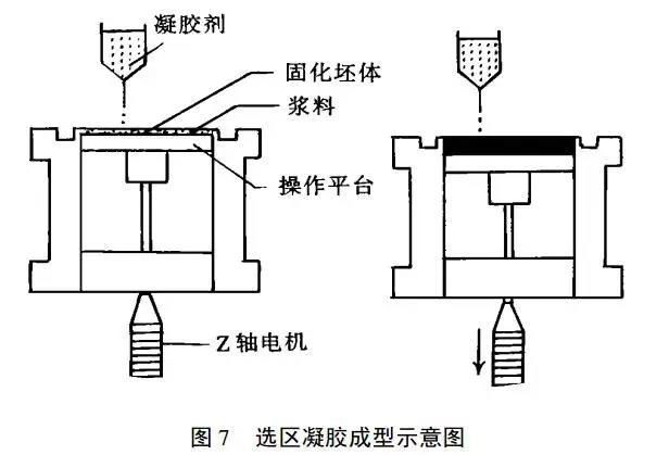 7、选区凝胶成型(SG) 该方法是利用海藻酸钠一价盐可以溶于水,而高价盐可以形成凝胶的原理来制备陶瓷坯体。首先将海藻酸钠和陶瓷粉制成低粘度水性浆料(固相含量约为50vol%),然后利用刮刀将浆料铺展在工作平台上。利用喷墨打印技术滴入高价阳离子的盐溶液(如CaCl2)引发浆料的局部凝胶,通过计算机控制作用范围,就可以形成需要的形状。通过控制工作平台在z方向的位置,可以使新的一层浆料铺展在平台上。如此反复终就可以形成所需的陶瓷坯体。