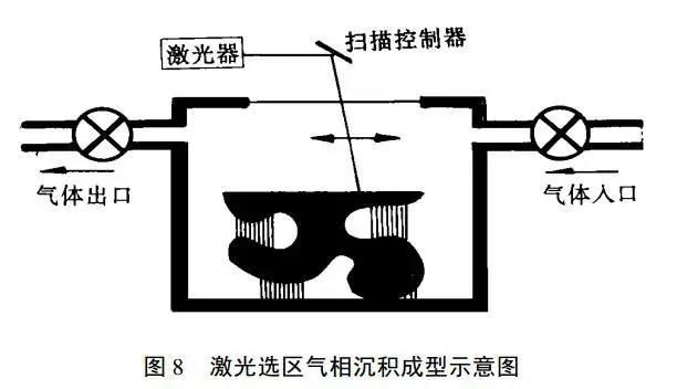 8、激光选区气相沉积成型(SALD) 利用计算机控制的激光束为气体提供反应区域。反应气体(如含碳气体CH4、C2H2等)在基片上沉积得到部件。该技术具有将简单陶瓷部件成型为复杂陶瓷部件的能力。