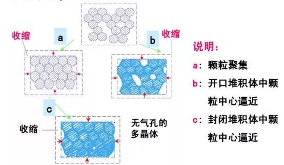 烧结是指成型后的坯体在高温作用下、通过坯体间颗粒相互粘结和物质传递,气孔排除,体积收缩,强度提高、逐渐变成具有一定的几何形状和坚固烧结体的致密化过程。在宏观和微观上对烧结现象进行观察,可以看到宏观上,烧结后的产物体积收缩,致密度提高,强度增加。微观上,气孔形状改变,晶体长大,成份变化(掺杂元素)。按照烧结过程中的变化,主要将烧结分为以下阶段: 1、烧结前期阶段 a.粘结剂等的脱除:如石蜡在250~400℃全部汽化挥发。 b.随着烧结温度升高。原子扩散加剧,空隙缩小,颗粒间由点接触转变为面接触,空隙缩小,连通孔隙变得封闭,并孤立分布。 c.小颗粒率先出现晶界,晶界移动,晶粒变大。 2、烧结后期阶段 a、孔隙的消除:境界上的物质不断扩散到孔隙处,使孔隙逐渐消除。 b、晶粒长大:晶界移动,晶粒长大。 陶瓷烧结主要可分为固相烧结和液相烧结,并分别对应着不同的反应机理。液相烧结的反应机理可简单归纳为熔化、重排、溶解-沉淀、气孔排除;按照烧结体的结构特征,将固相烧结机理划分为3个阶段:烧结初期、烧结中期和烧结后期。