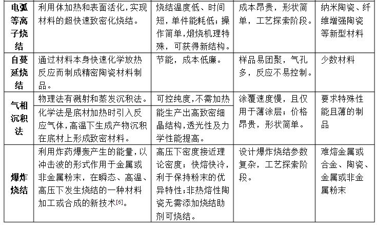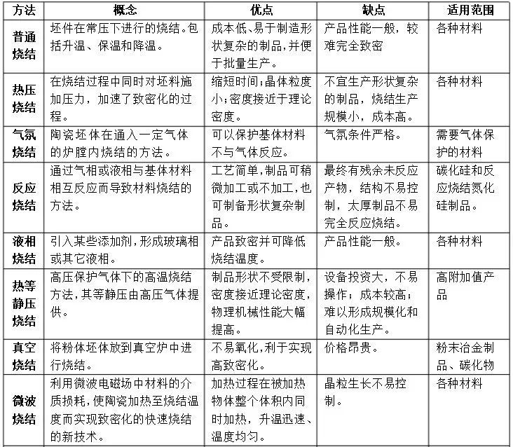 烧结前期:在烧结初期,颗粒相互靠近,不同颗粒间接触点通过物质扩散和坯体收缩形成颈部。在这个阶段,颗粒内的晶粒不发生变化,颗粒的外形基本保持不变。 烧结中期:烧结颈部开始长大,原子向颗粒结合面迁移,颗粒间距离缩小,形成连续的孔隙网络。该阶段烧结体的密度和强度都增加。 烧结后期:一般当烧结体密度达到90%,烧结就进入烧结后期。此时,大多数孔隙被分隔,晶界上的物质继续向气孔扩散、填充,随着致密化继续进行,晶粒也继续长大。这个阶段烧结体主要通过小孔隙的消失和孔隙数量的减少来实现收缩,收缩缓慢。 特种陶瓷烧结方法 人们根据不同的依据分别对陶瓷的烧结方法进行分类,其特点及适用范围如下:
