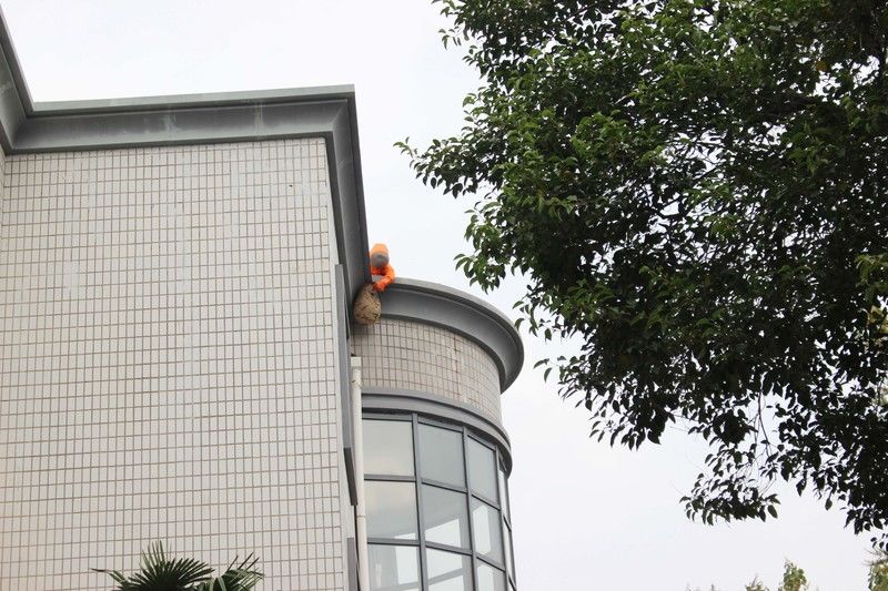 10月25日上午,经公司人员反应,在陶誉科创大楼外立面悬挂有一个大型的马蜂窝,由于悬挂在大楼的顶部,日常保洁难以发现。 公司得知消息后立刻发动,拨打119联系丁山消防大队,同时通知在楼企业将门窗紧闭,在当天上午顺利将马蜂窝进行杀灭摘除处置,对日常工作开展和人身安全没有造成不利影响。