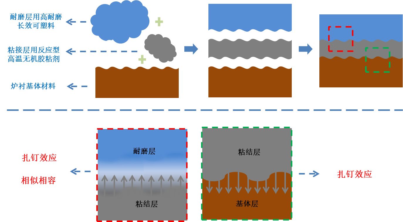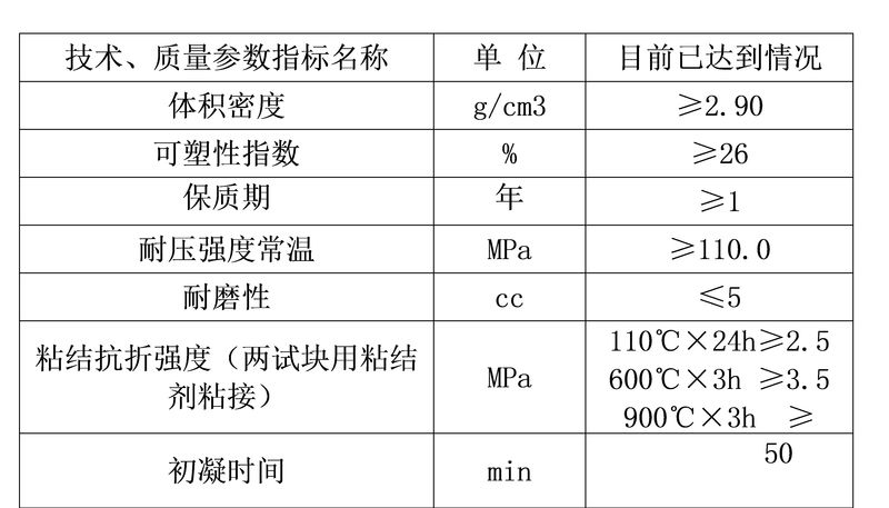 四、产品技术优势 1)保存期:其保存期可达12个月以上,而目前的传统磷酸盐可塑料保存期不到3个月; 2)固化可控性:固化时间在30~80分钟内可控。 3)耐磨性和强度:采用复合结合剂,在固化过程中两者都会发生自身聚合,形成复杂的立体网状的大分子复合结构,进一步提高材料的强度和耐磨性。复合的强度和耐磨性比传统材料高出30%,综合使用寿命达1年以上。 4)结合强度:产品采用梯度复合层,利用粘接层/基体材料的扎钉效应和粘接层/耐磨层中的溶胶增强化学结合相互交联,互相啮合的界面特性,弥补传统过渡层的界面性能缺陷,使过渡层在高温使用的过程中不易脱落及损毁,延长修补炉衬面的整体使用寿命。