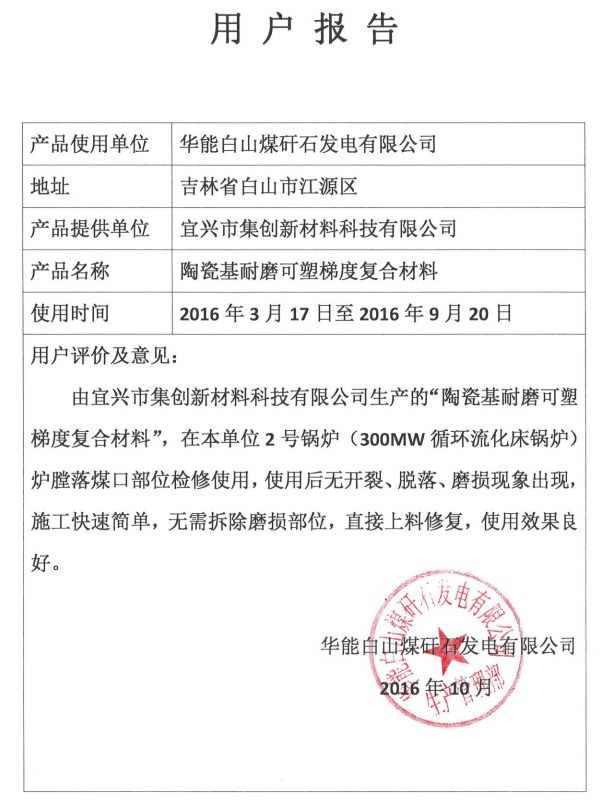 一、企业简介 宜兴市集创新材料科技有限公司成立于2015年12月21日,是由武汉科技大学联合兴贝公司共同组建的“生产服务型”高科技新材料研发生产服务性公司,主要定位于CFB锅炉防磨损检修工程耐火材料的研发及应用。“陶瓷基耐磨可塑梯度复合材料”产品的开发,取代CFB锅炉内衬检修的传统方法,实现CFB锅炉检修“快”“好”“省”的应用效果,为CFB锅炉的稳定运行提供了有力保障,避免因停炉检修造成的重大经济损失。