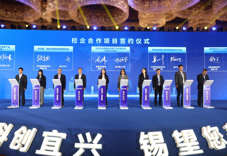 本次活动宜兴、杭州两地政校企三方深化互信、携手共进取得重要成果。活动中,入孵企业尚臻新材料与浙江大学王家邦教授合作的“高镍锂电池三元正极材料烧结用长寿命抗腐蚀匣钵项目”登台进行签约展示。